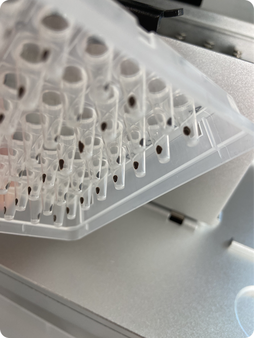 Since the magnetic force of the magnets used in the self-made magnetic plate (Figure 4) is much higher than that of the supplied magnetic plate and we use bar magnets, the pin-sized round bead pellet is located approx. 4 mm above the bottom of the reaction vessel. This prevents bead carryover, which is extremely important. In contrast to the supplied magnets which localizes the bead pellet rod-shaped to the bottom of the reaction vessel wall and a carry-over of beads is likely.